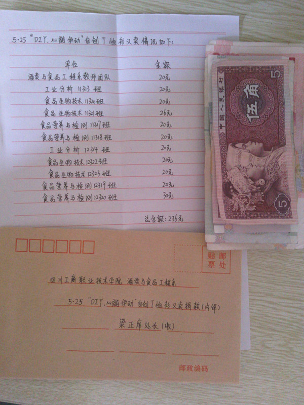 6月7日,酒类与食品工程系女生部将DIY爱心T恤义卖所得善款捐给由员工处发起筹建的贫困生专项基金。