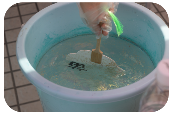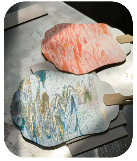 活动现场,师生们以漆为媒、以扇为纸,一点、一甩、一划,水波荡漾间,扇面呈现出斑斓图案,似山峦、似星云、似湖海……流动的色彩被定格,摇曳的不只是漆色,更是瑰丽的想象。指尖翻飞中,一把把独一无二又极具中式写意风格的漂漆扇作品就此诞生,精美扇面挥洒着诗情画意,精致演绎了中国传统美学。