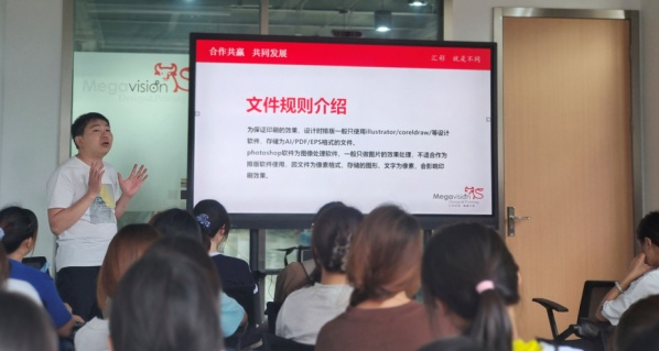 在汇彩设计印务座谈会中,企业老师简要介绍了企业的生产规模及分工,为同学们讲解了生产中的文件规则,辨析了文件保存形式的区别及原因。