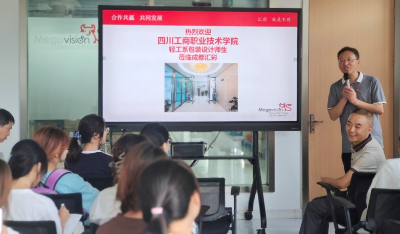 宽窄印务座谈会中,总经理彭友琼代表企业发言,为同学们播放企业宣传片,介绍公司包装设计、产品赏析等,会后企业高涵铃老师带领公司员工参观了宽窄企业印刷中心及智能包装中心,同学们认真聆听企业师傅的讲解,并就生产产品进行设计工艺交流。