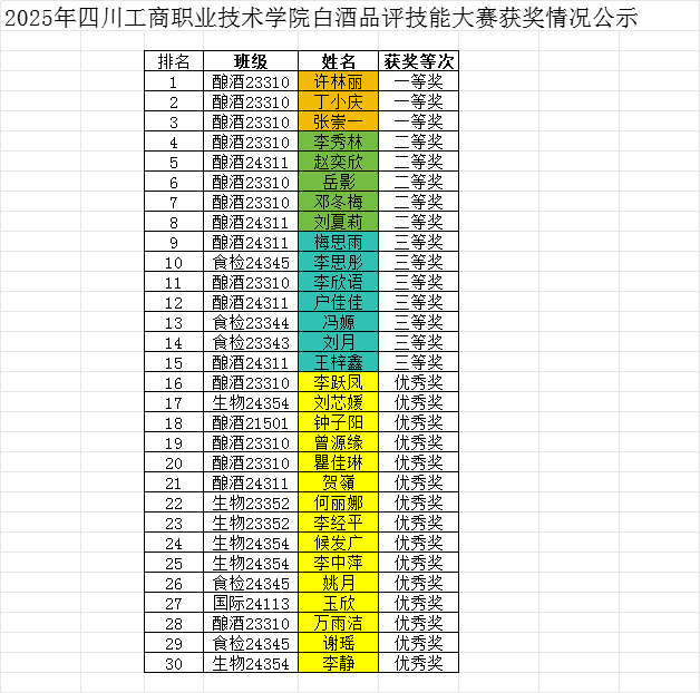 比赛历时两天,经过专业知识与品酒技能的激烈比拼,许林丽、丁小庆、张崇一斩获大赛一等奖;李秀林、赵奕欣、岳影、邓冬梅、刘夏莉获得二等奖;梅思雨、李思彤、李欣语等7位同学获得三等奖;李跃凤、钟子阳、职工玉欣等15名同学获得优秀奖。大赛选拔的优秀选手将参加全国老员工品酒比赛赛前培训,并有机会晋级省级与国家级大赛。