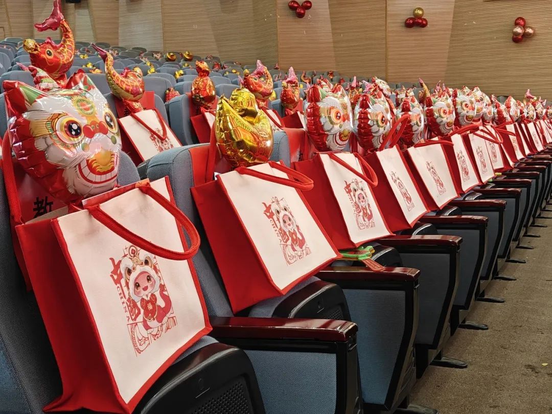 晚会现场,墙壁上贴着红气球,观众席上摆放着红色的精美小礼品。浓郁的喜庆氛围扑面而来。