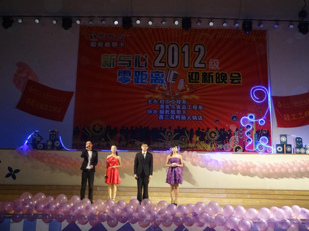 2012年10月17日晚,酒食系与轻工系联合举办的“新与心·零距离”2012级迎新晚会于素质拓展馆篮球场举行。参加本次晚会的领导主要有酒食系团总支书记林晶晶、轻工系书记李华、轻工系团总支书记郭海燕及两系辅导员老师等。