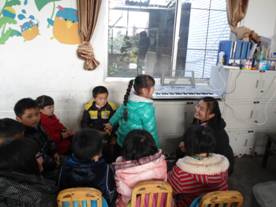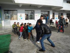 志愿者们带着小礼物和糖果,爱心和热诚,以及自己的知识和才能来到了孩子们身边。志愿者分为五个组,分别与大、中、小班以及学前班各个年龄层的孩子一起进行活动。他们温柔耐心,他们真诚友善,他们寓教于乐。有的教孩子们画画,有的教孩子们搭积木,有的教孩子们唱歌,其中有一组志愿者还教学前班孩子们跳了骑马舞,整个幼儿园欢声笑语,和乐融融。