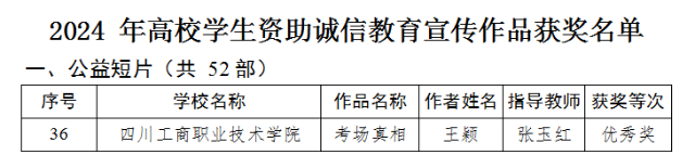 近日,四川省教育厅、中国人民银行四川省分行公布了2024年全省高校员工资助诚信教育宣传作品评选结果,公司参赛作品《考场真相》获公益短片组优秀奖。