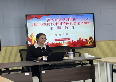 胡中丽老师作深入开展学习贯彻习近平新时代中国特色社会主义思想主题教育的理论宣讲。胡中丽老师紧紧围绕《习近平著作选读》(第一卷)展开宣讲,指出《习近平著作选读》反映了我们党在新时代推进马克思主义中国化时代化取得的重大理论创新成果,是党员同志深入学习贯彻习近平新时代中国特色社会主义思想的权威教材。第一,要抓住一个主题——新时代坚持和发展中国特色社会主义。党员同志要明确“中国特色社会主义是社会主义而不是其他什么主义”,要准确把握中国特色社会主义是近代以来中国社会发展的必然选择、中国共产党百年奋斗得出的历史结论、是实现中华民族伟大复兴的必由之路。第二,要把握一个核心——坚持和加强党的全面领导。党政军民学,东西南北中,党是领导一切的。新时代新征程,世界百年未有之大变局加速演进,中华民族伟大复兴进入关键期,国家发展面临新形势新任务,必须全面坚持和加强党的领导,充分发挥党总揽全局、协调各方的领导核心作用。第三,要坚定一个立场——人民至上。习近平总书记强调,“江山就是人民,人民就是江山,人心向背关系党的生死存亡”,始终同人民在一起、为人民利益而奋斗,是我们党的出发点和落脚点。在发展道路上,要坚持人民民主,更好地把人民的智慧和力量凝聚到党和人民事业中来。